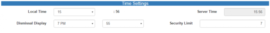 The time value shown on the right side of the screen titled Server Time is the current time on the server. The left side displays the time at it is locally at the school. If the current time at the school is different than the server time, adjust the local time value to that it is correct. For example, if the server shows the time as 15:56 (3:56 PM) but the current time at the school is actually 1:56 PM, then set the Local Time value to 13 to represent 1 PM.