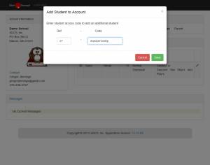 The second function you may perform is to add students to your account. Click on the green plus indicator to add an additional student. In order to add an additional student, you will need to have the student Reference-Code. After entering the reference code and pressing Save the student section will update with the current students. If a new one has been successfully added, he or she will appear here. If an error has occurred, a yellow message will appear at the top of the screen.