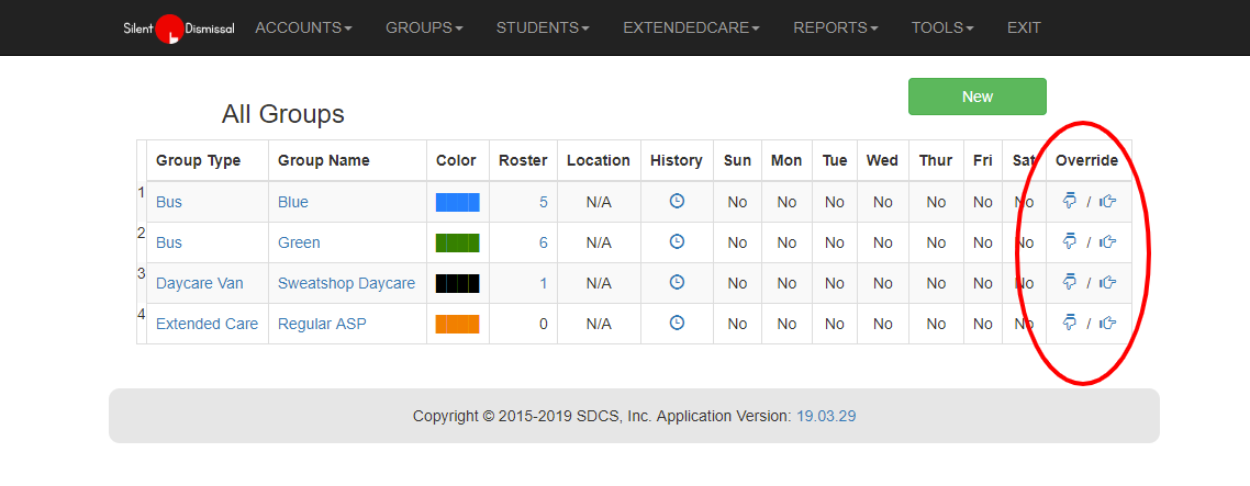 Setting overrides for a group in this manner may only be done for the current day by selecting one of the two icons in the right column.