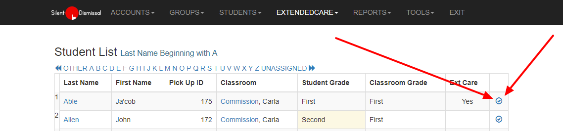 - The second row displays the student's name, pick up ID number, grade level, and classroom assignment