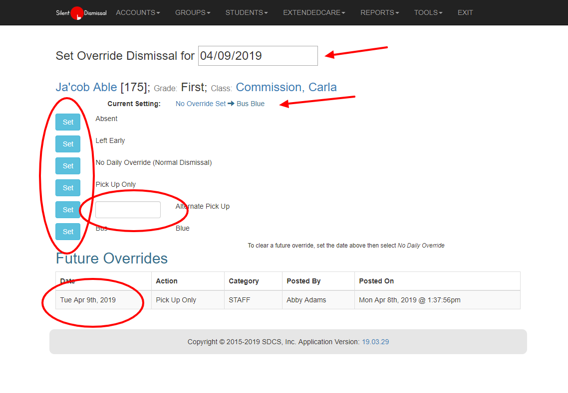 - Set the date at the top to match the date for an override and select No Daily Override (Normal Dismissal) to clear a future dated override